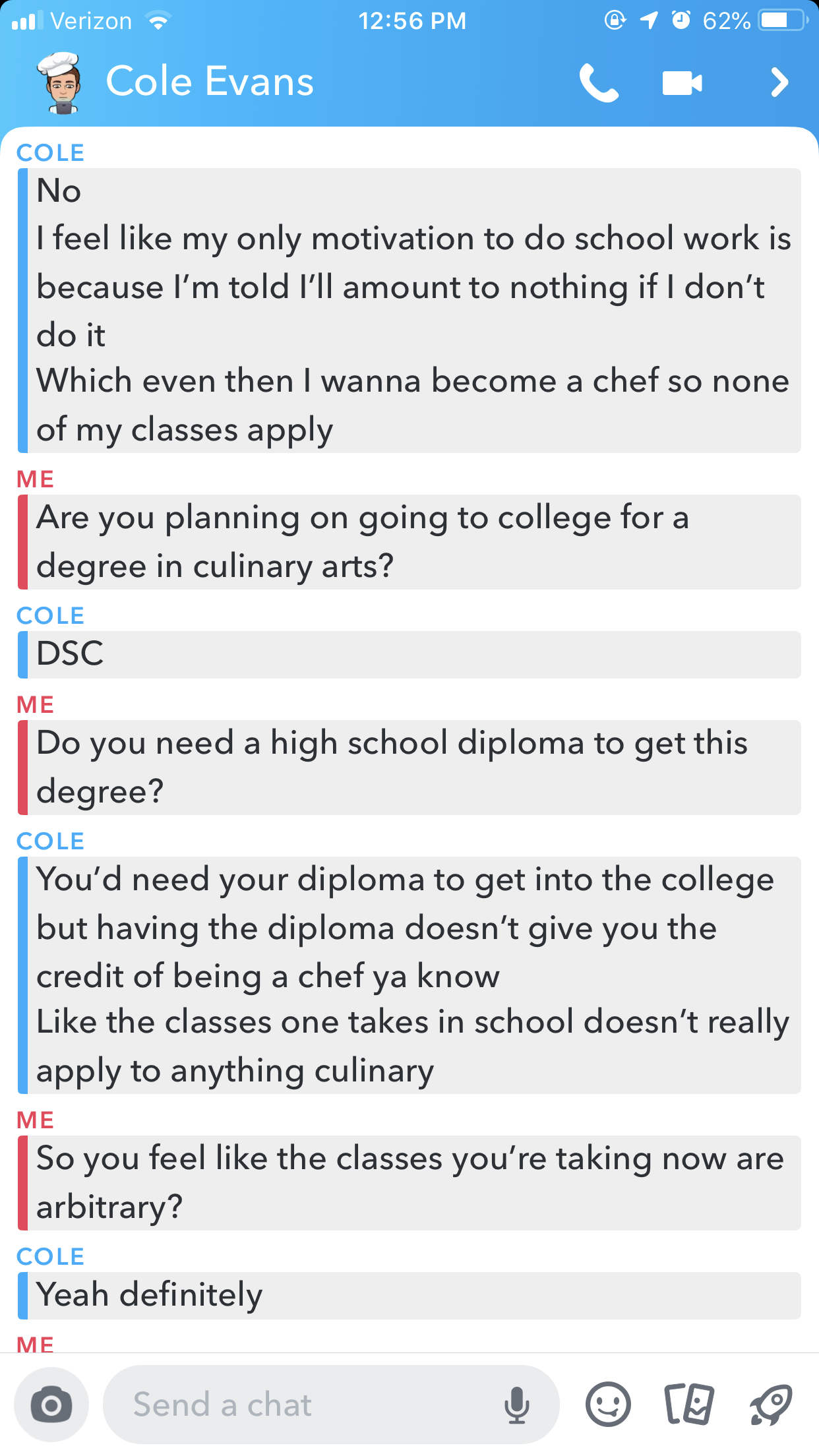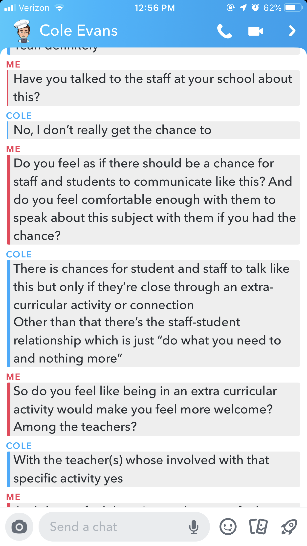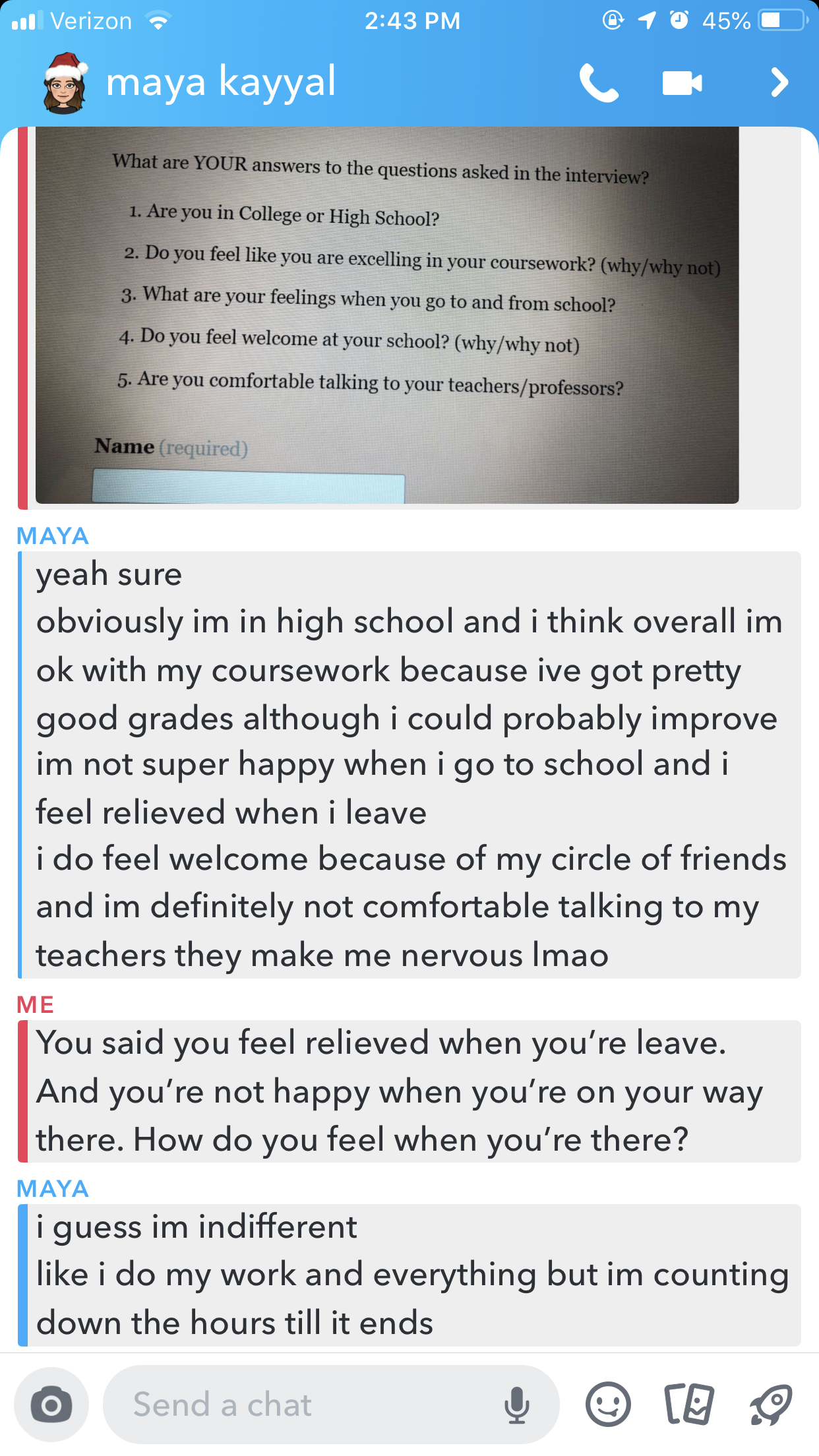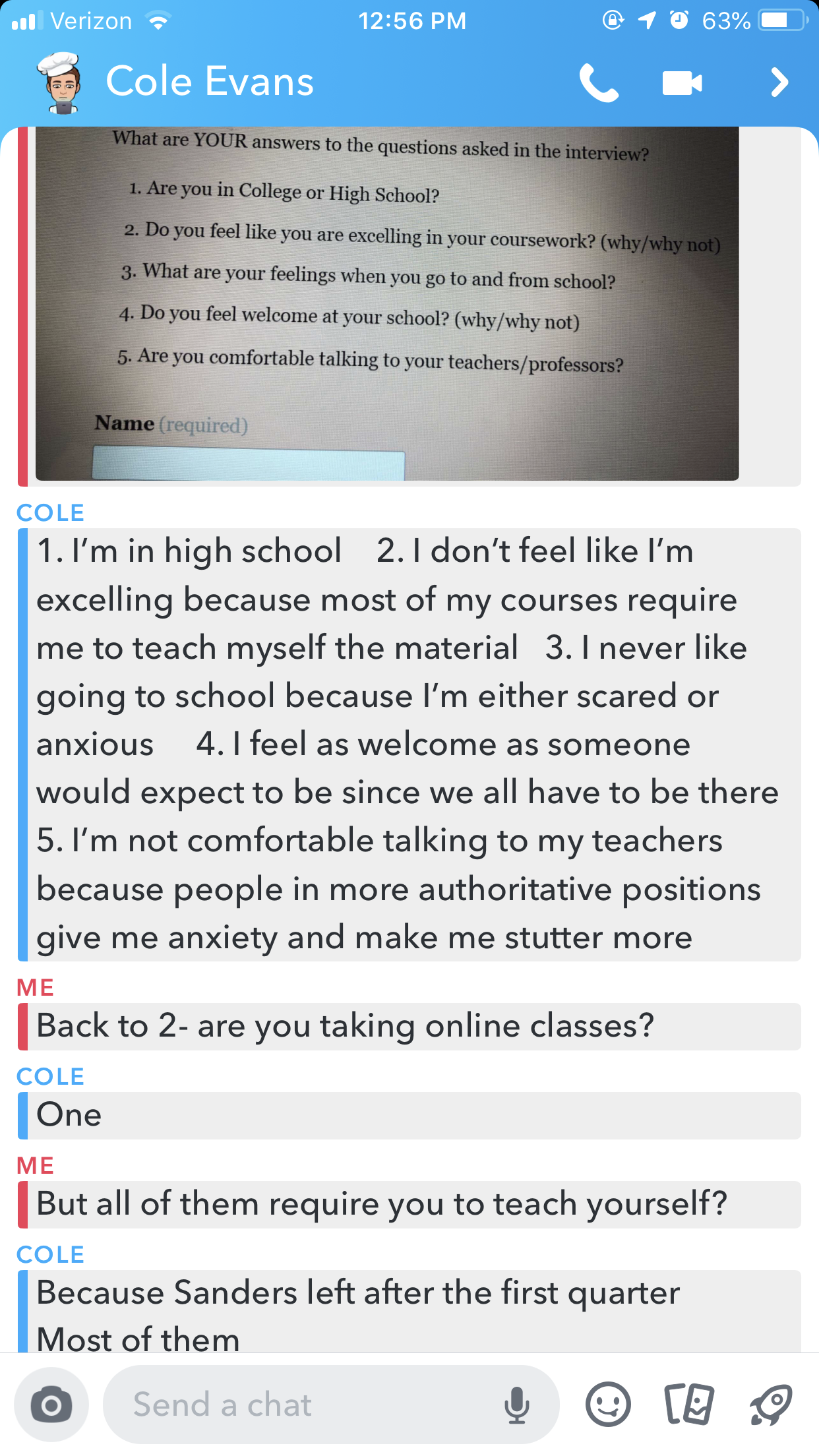 I began this conversation by sending him questions from my feedback page to answer. After he answered the questions, I understood that he was very opinionated on this topic, and I started to dig deeper on the matter. I thought it was interesting that he said he was teaching himself. If he wasn’t getting help with his curriculum at school, I was doubting that he was getting help with his mental health.