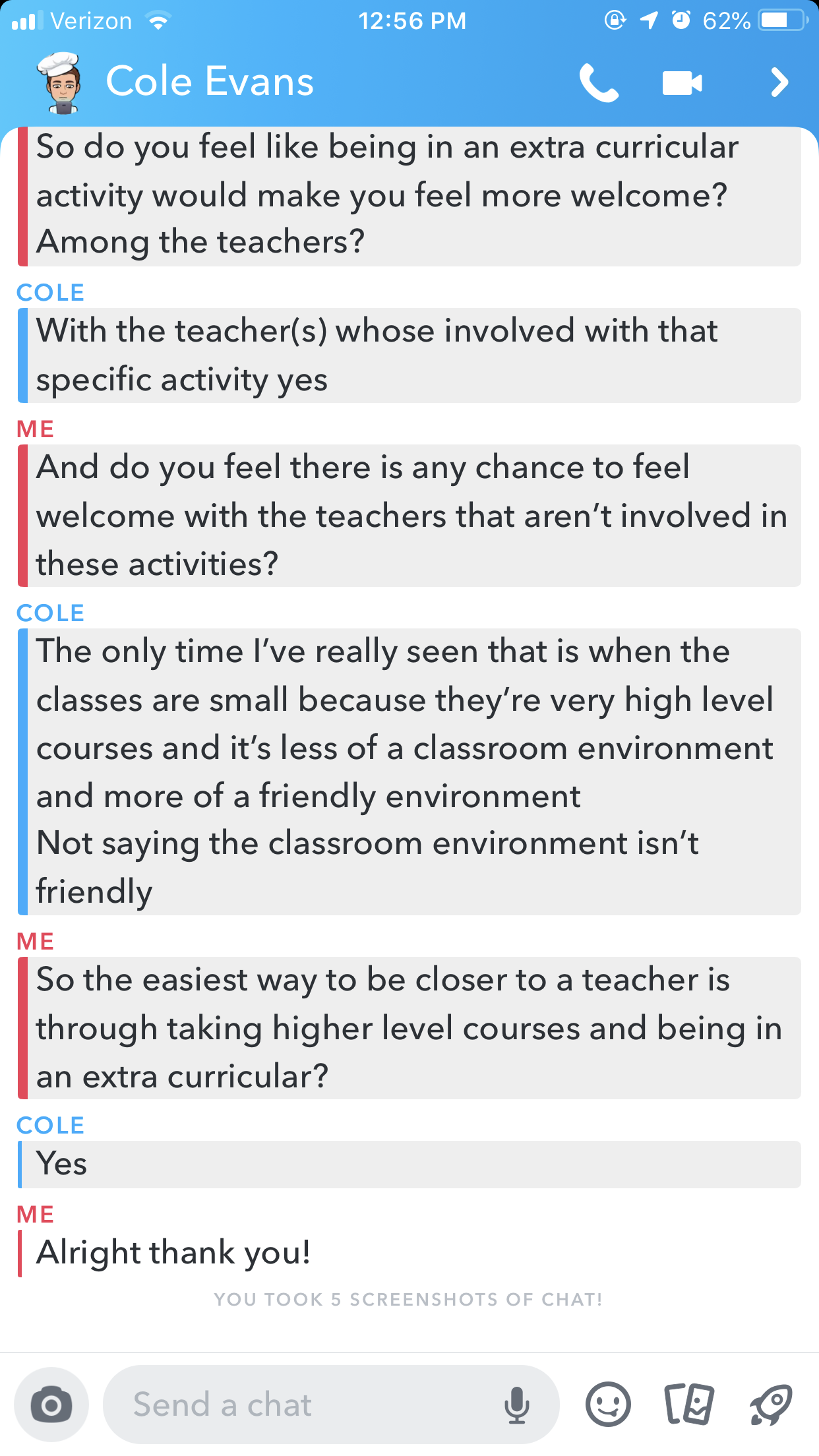 Chloe:”Interesting, do you feel comfortable talking to you professors?”